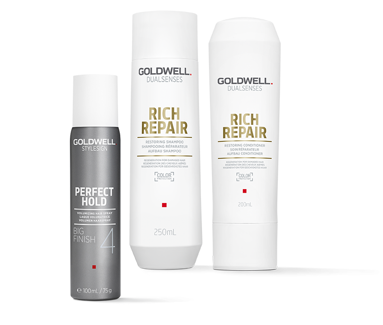 Dieses Weihnachtsset besteht aus Goldwell dualsenses Rich Repair Restoring Shampoo 250ml, Goldwell dualsenses Rich Repair Restoring Conditioner 200ml und Goldwell Style Sign Perfect Hold Big Finish 100ml