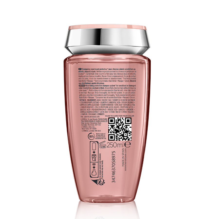 Pflegendes, schützendes Haarbad für mittelstarkes bis kräftiges coloriertes, geschädigtes oder sensibilisiertes Haar. Intensive Pflege für coloriertes Haar. Verleiht Ihrem Haar sofortige Geschmeidigkeit. Versiegelt poröses Haar für maximalen Farberhalt.Ohne Sulfate. Es versorgt die Haarfaser sanft mit Feuchtigkeit, pflegt das Haar und schützt die Haarfarbe. Lässt das Haar auf natürliche Weise leuchten. Sorgt für bis zu 95 % genährteres Haar* und mindert seine Porosität, um die Farbe länger zu bewahren. Bewahrt 92 % der Farbintensität nach 6 Wochen (BAIN RICHE + SOIN ACIDE + MASQUE).