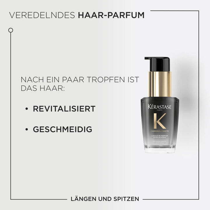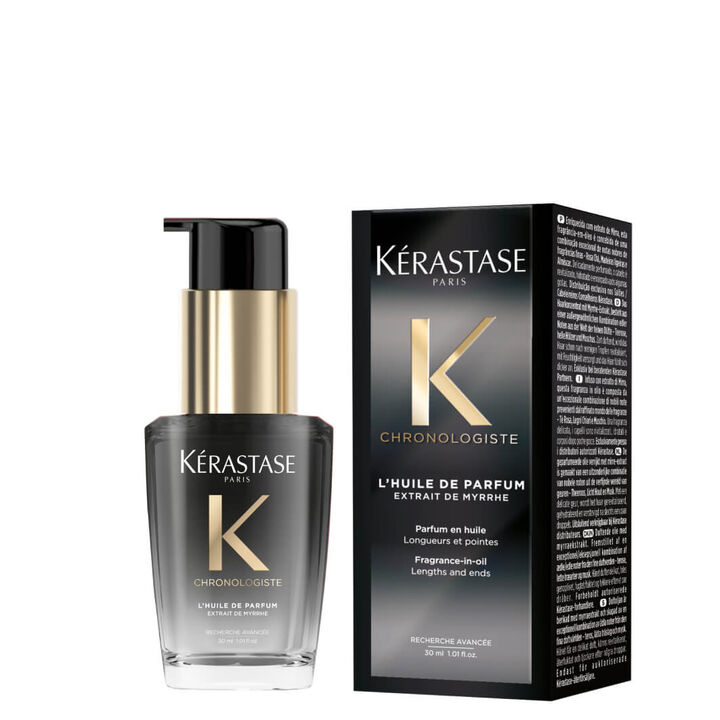 Das mit Myrrhe-Extrakt angereicherte L'Huile de Parfum Chronologiste von Kérastase ist ein Parfum in Form eines Haaröls, das aus einer außergewöhnlichen Kombination edler Duftnoten aus der Welt der feinen Parfümerie besteht: Teerose, leichte Holzdüfte und Moschus. Das zartduftende Haar ist bereits nach wenigen Tropfen revitalisiert, mit Feuchtigkeit versorgt und dicker.