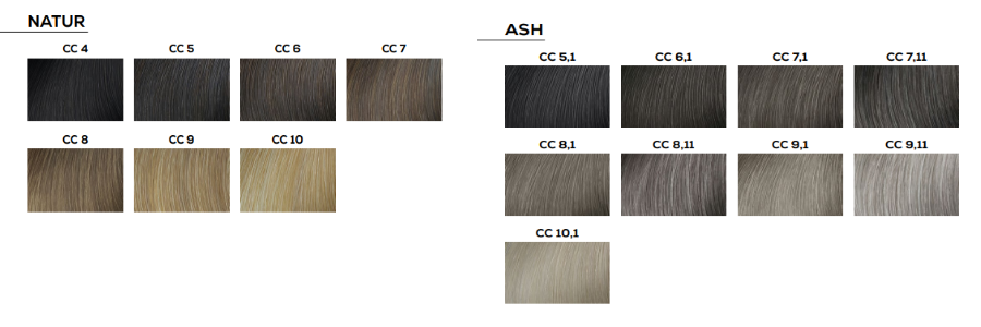 | Farbe: | 4 mittelbraun, 4,3 mittelbraun Goldbeige, 5 hellbraun, 5,1 hellbraun asch, 5,3 hellbraun Goldbeige, 5,18 hellbraun Asch Mokka, 6 Dunkelblond, 6,1 Dunkelblond Asch, 6,3 Dunkelblond Goldbeige, 7 Mittelblond, 7,1 Mittelblond Asch, 7,3 Mittelblond Goldbeige, 7,11 Mittelblond tiefes Asch , 7,18 Mittelblond Asch Mokka, 7,82 CC MITTELBLOND MOKKA IRISÉ, 8 Hellblond, 8,1 Hellblond Asch, 8,3 Hellblond Goldbeige, 8,11 Hellblond tifes Asch, 9 sehr helles blond, 9,1 sehr helles blond Asch, 9,11 sehr helles blond tiefes Asch, 9,82 SEHR HELLES BLOND MOKKA IRISÉ, 10 Platinblond, 10,1 Platinblond Asch |