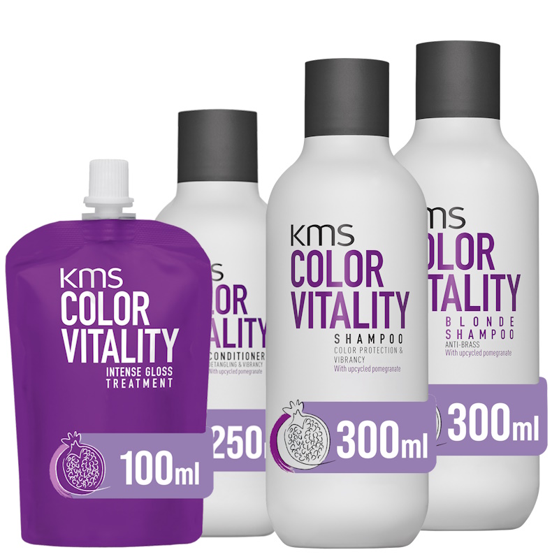 Weihnachtsset im KosmetikbeutelDieses Weihnachtsset besteht aus KMS Colorvitality Shampoo 300ml, KMS Colorvitality Conditioner 250ml, KMS Hairplay Makeover Spray 75ml und KMS Hairstay Working Spray 75ml.Farbschützende ReinigungReinigung für coloriertes Haar, die die Haarfarbe 3x so lange bewahrt. Verbessert die Intensität und Brillianz der Haarfarbe. Es hilft, die Farbe ins Haar einzuschließen und sorgt für Lebendigkeit und Glanz. Da die Haare glänzend aussehen und sich geschmeidig anfühlen, wirken sie, als kämen Sie frisch vom Friseur. Der enthaltene AHA-Structure-Complex sorgt für Wiederaufbau des Haarinneren und Glättung der Haaroberfläche. Die Haarfarbe wirkt strahlend und intensiv. Vegan, frei von Weizen und dermatologisch getestet. Geeignet für gefärbtes und chemisch behandeltes Haar. - bewahrt Haarfarbe - Intensität - Brillianz - Lebendigkeit - Glanz - Vegan, frei von Weizen, dermatologisch getestetAnwendungFür alle Haartypen geeignet. Shampoonieren und ausspülen, bei Bedarf wiederholen. Anschließend kann mit einem Conditioner weitergearbeitet werden.Farbschützende PflegeSchützt coloriertes Haar vor dem Verblassen der Haarfarbe und pflegt es intensiv, dass die Haare geschmeidig sind und intensiv glänzen. Schenkt gefärbtem, getöntem und gesträhntem Haar Farbschutz und Leuchtkraft. Der enthaltene AHA-Structure-Complex sorgt für Wiederaufbau des Haarinneren und Glättung der Haaroberfläche. Außerdem enthält der Conditioner einen UV-Filter, der das Haar vor UV-Belastung und licht bedingter Farbverblassung schützt.Der cremige Conditioner entwirrt das Haar,und schenkt ihm eine verbesserte Kämmbarkeit. Vegan, frei von Weizen und dermatologisch getestet. - Farbschutz - pflegt - geschmeidig - glänzen - UV-Filter - Kämmbarkeit - Vegan, frei von Weizen, dermatologisch getestetAnwendungFür alle Haartypen geeignet. Auf gewaschenes Haar auftragen und zwei Minuten einwirken lassen, dann ausspülen.Trockenshampoo