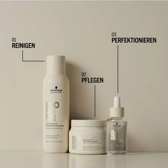 Die BOND REPAIR TECHNOLOGIE schafft ein fortschrittliches Netzwerk aus zwei Arten von Faserverbindungen - Wasserstoff- und Ionenverbindungen - die zusammenwirken, um eine stabile und dennoch flexible Haarstruktur zu schaffen. In Kombination mit reichhaltigem Mandelöl schützen unsere Formeln blondes Haar davor, trocken, spröde oder porös zu werden. Leichte Polymere in Kombination mit Weißtee-Extrakt, der für seine antioxidativen und revitalisierenden Eigenschaften bekannt ist, bilden einen Schutzschild, der den Lotusblatteffekt nachbildet - so wird die blonde Schuppenschicht effektiv vor äußeren Einflüssen wie Schadstoffen geschützt, die blondes Haar stumpf und kraftlos erscheinen lassen können.