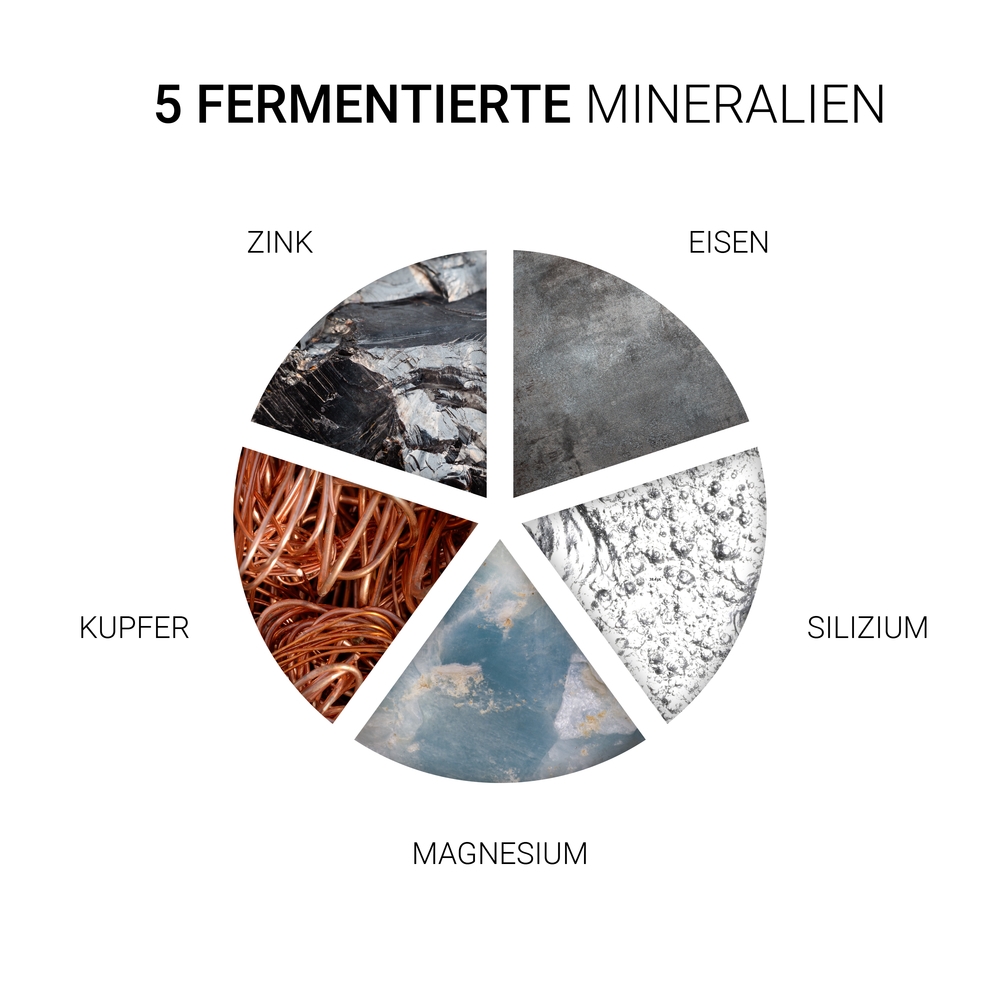 Die enthaltenen Mineralien sind von wesentlicher Bedeutung für den Zustand von Körper, Haut und Haar. Die Essential Formulierungen sind angereichert mit einer Kombination aus 5 fermentierten Mineralien: