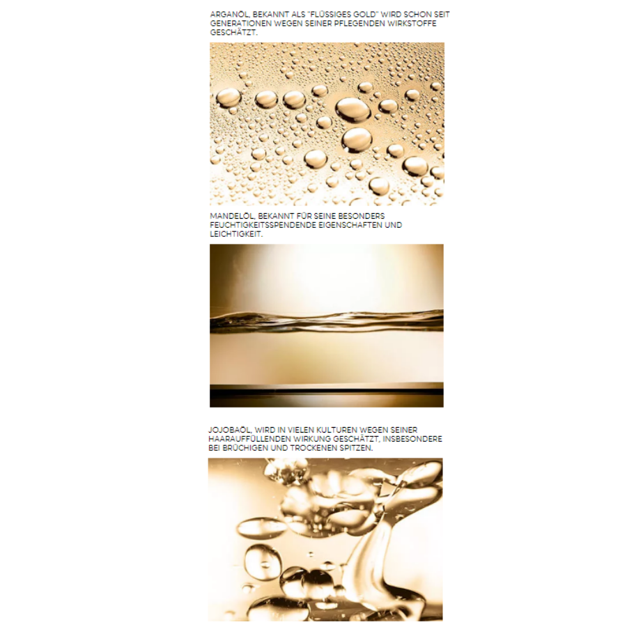 Diese Pflege mit Arganöl angereichert verleiht dem Haar eine langanhaltende Geschmeidigkeit und sorgt dafür, dass es seidig glänzt. Die Haarbeschaffenheit wird veredelt und dank der hochwertigen Pflegeformel das Haar von innen heraus genährt. Eine natürliche, glänzende und gesunde Brillianz entsteht. Schädigungen durch Styling und Föhnhitze werden verringert. Ein weiches, gepflegtes Haargefühl entsteht.